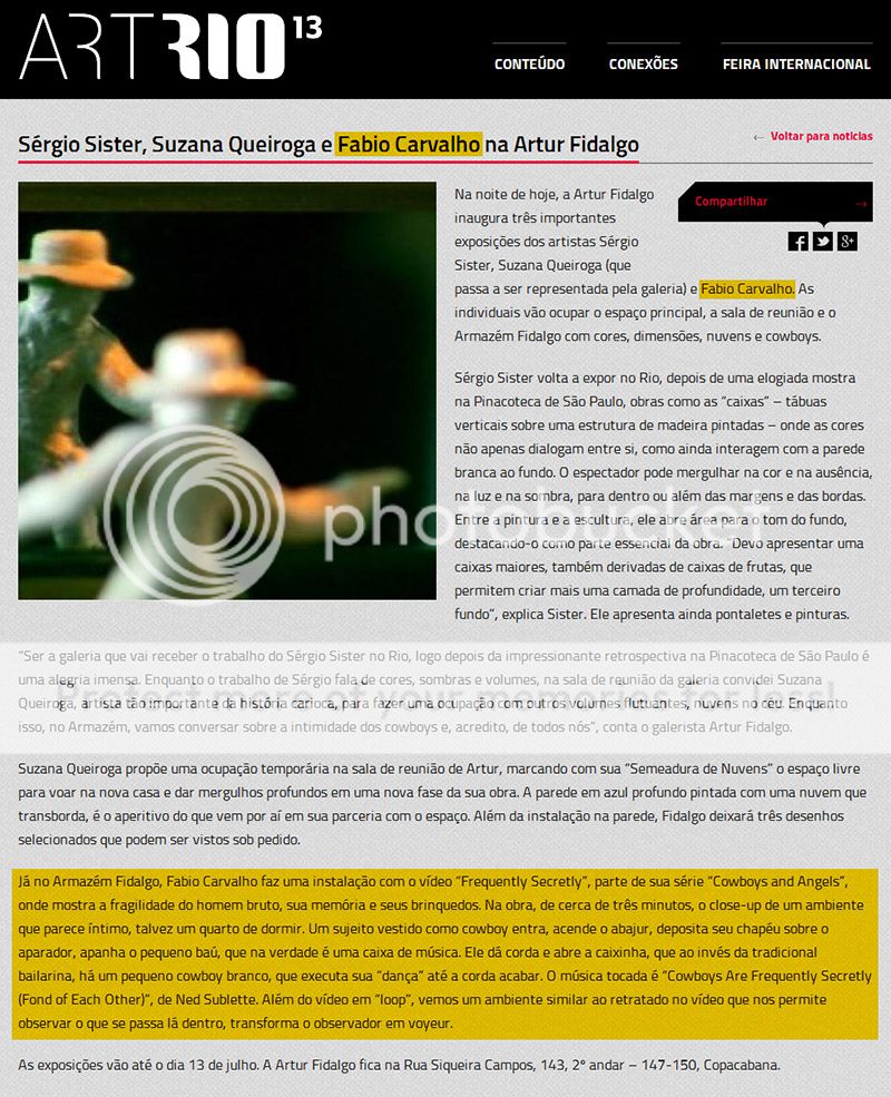 Fábio Carvalho apresentou durante os meses de junho e julho de 2013 na galeria Artur Fidalgo a instalação “Frequently Secretly”, com vídeo e objetos diversos, que faz parte da sua série de trabalhos “Cowboys and Angels”, onde procura apontar possíveis fragilidades escondidas no estereótipo do homem viril bruto, retratado na figura mítica do cowboy, perpetuado pelo cinema e TV.