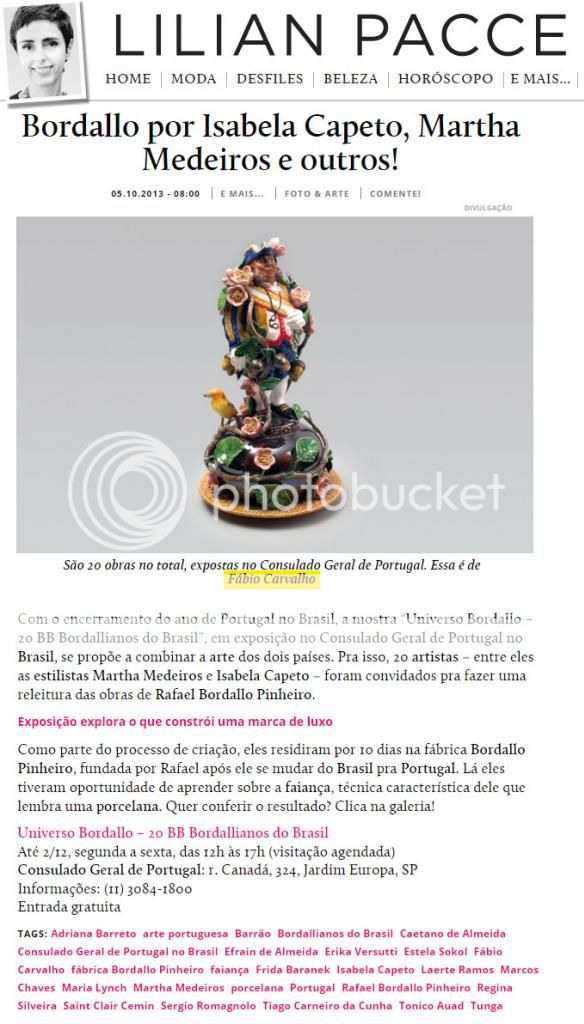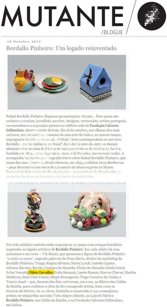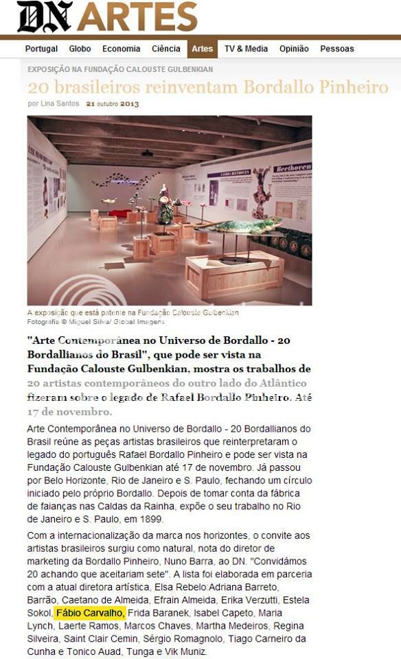 Depois de ter integrado a Residência Artística "Bordallianos Brasileiros" na Fábrica de Faianças Artísticas Bordallo Pinheiro em Caldas da Rainha, Portugal, em 2011, Fábio Carvalho participou de outubro a novembro de 2013 de uma exposição de lançamento da coleção "20 Bordallianos do Brasil" em Portugal. A exposição aconteceu na Fundação Calouste Gulbenkian, em Lisboa.