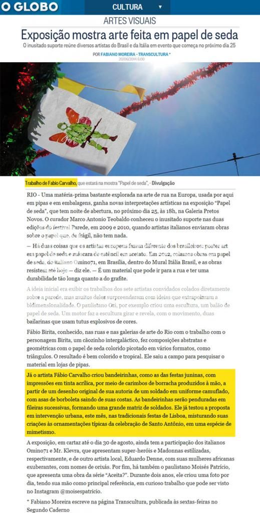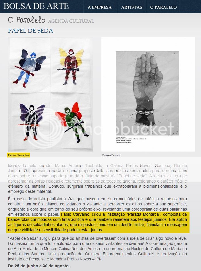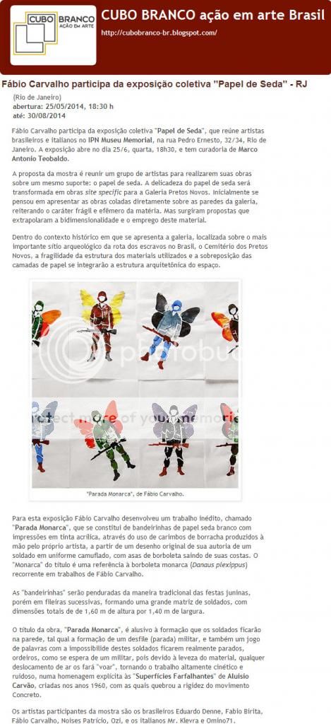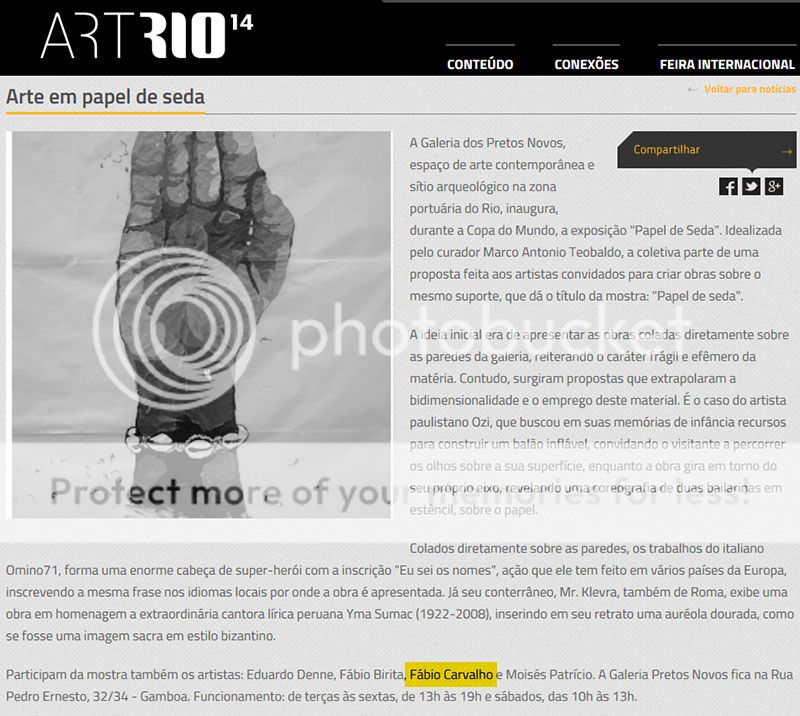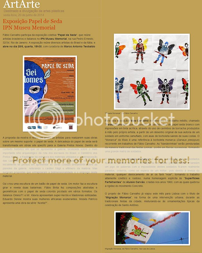 Fábio Carvalho participa da exposição coletiva "Papel de Seda", que reúne artistas brasileiros e italianos no IPN Museu Memorial, na rua Pedro Ernesto, 32/34, Rio de Janeiro. A exposição abre no dia 25/6, quarta, 18h30, e tem curadoria de Marco Antonio Teobaldo.