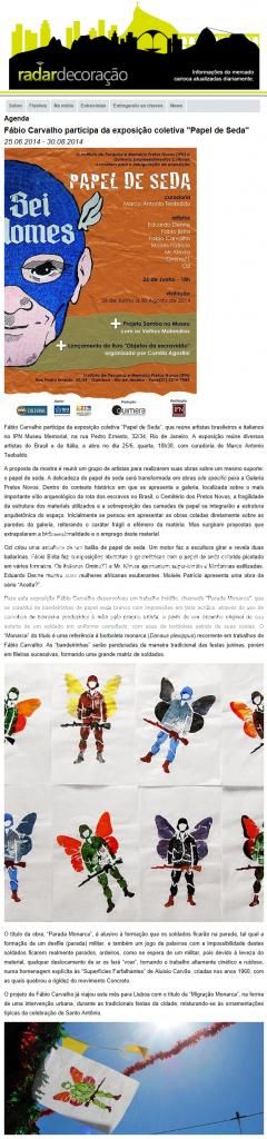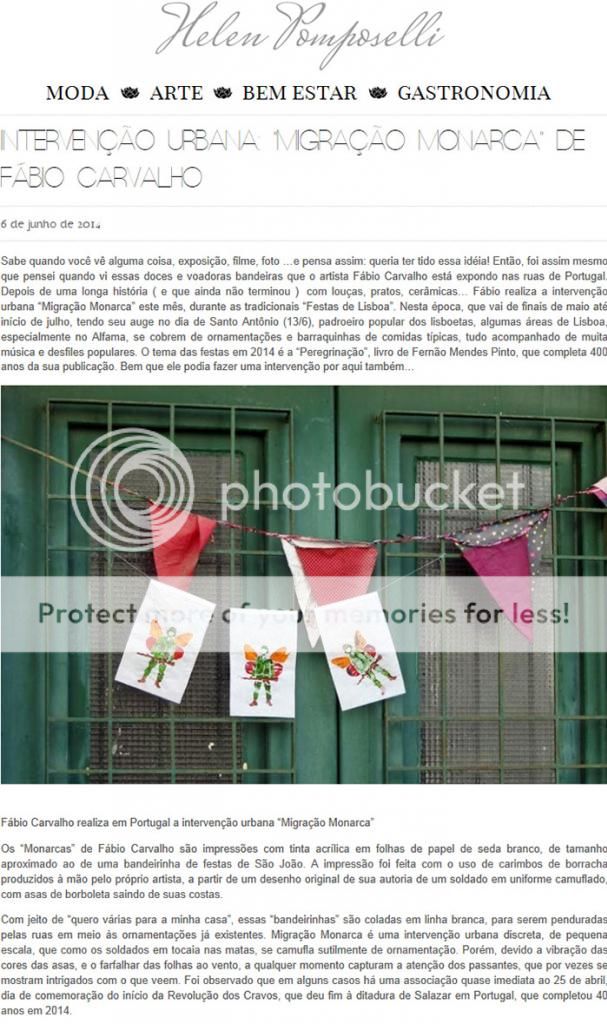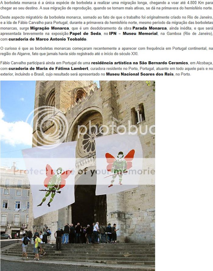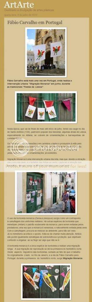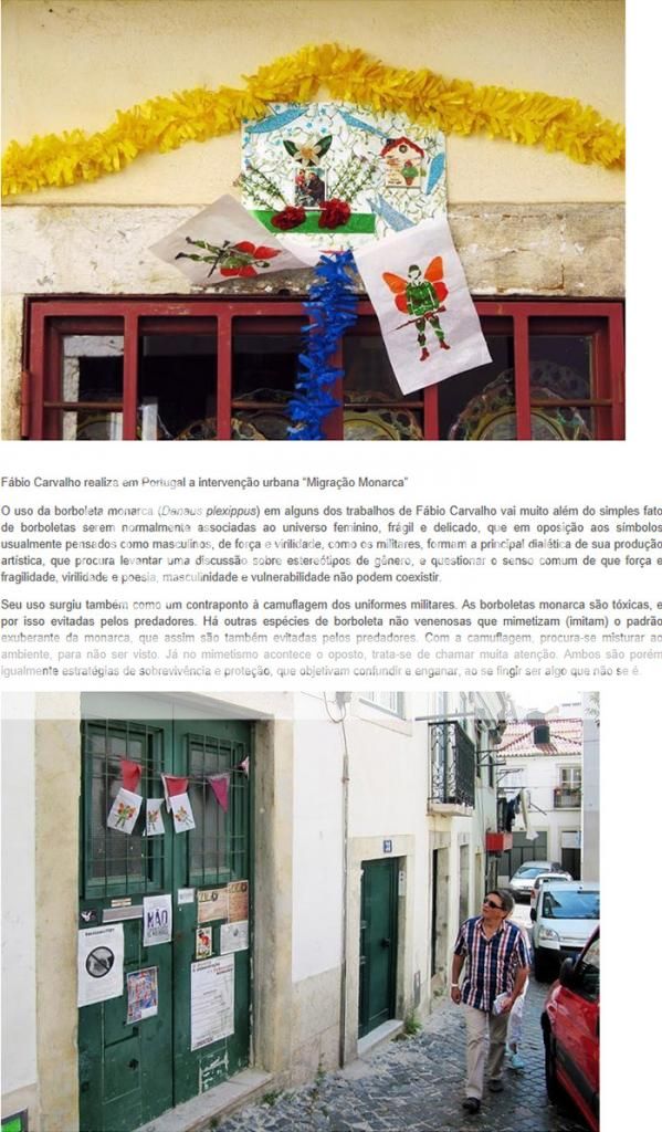 Fábio Carvalho está mais uma vez em Portugal, onde realiza a intervenção urbana "Migração Monarca" em junho, durante as tradicionais "Festas de Lisboa". Nesta época, que vai de finais de maio até início de julho, tendo seu auge no dia de Santo Antônio (13/6), padroeiro popular dos lisboetas, algumas áreas de Lisboa, especialmente no Alfama, se cobrem de ornamentações e barraquinhas de comidas típicas, tudo acompanhado de muita música e desfiles populares. O tema das festas em 2014 é a "Peregrinação", livro de Fernão Mendes Pinto, que completa 400 anos da sua publicação.