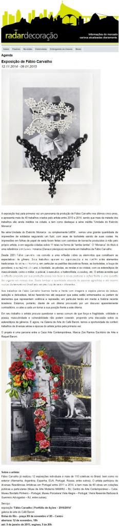 As duas obras que Fábio Carvalho apresentará ("Em Pele de Cordeiro" e "Gêmeos") são resultado da residência artística realizada em junho de 2014 na Cerâmica PP&A São Bernardo, em Alcobaça. Portugal.