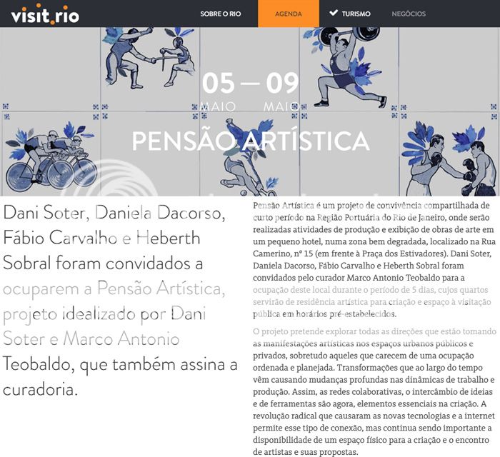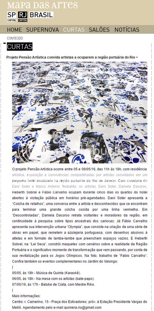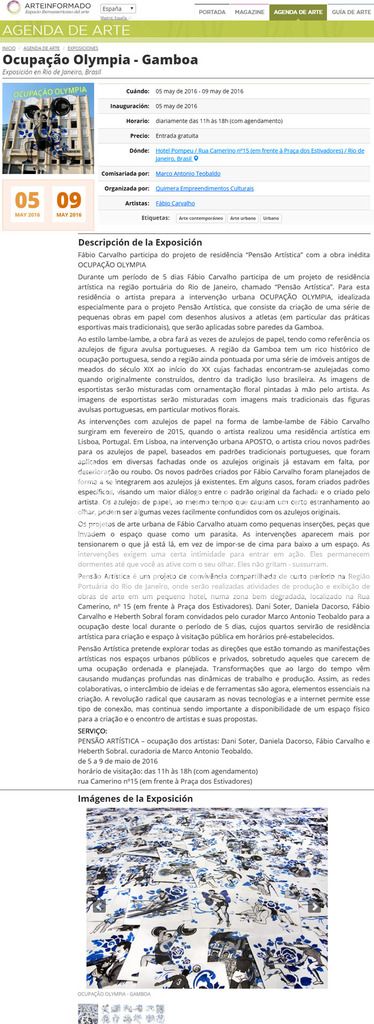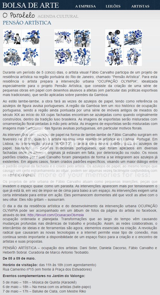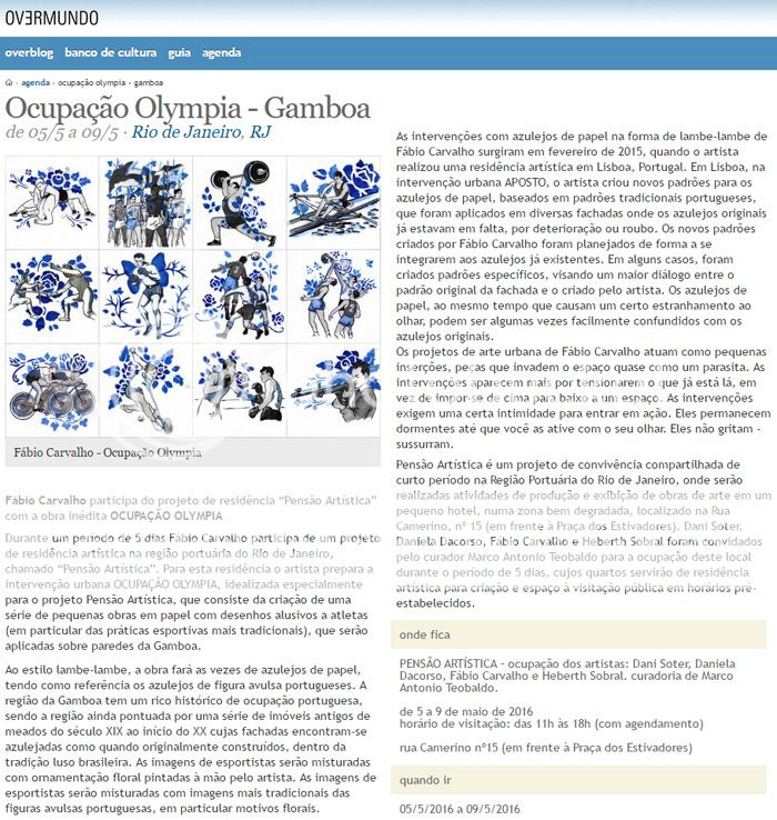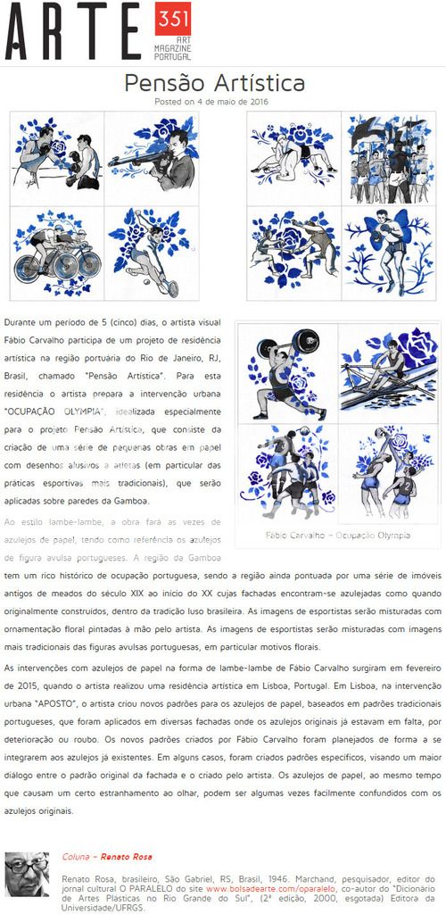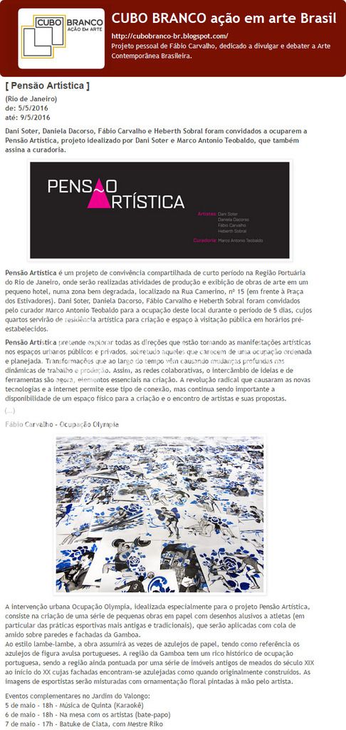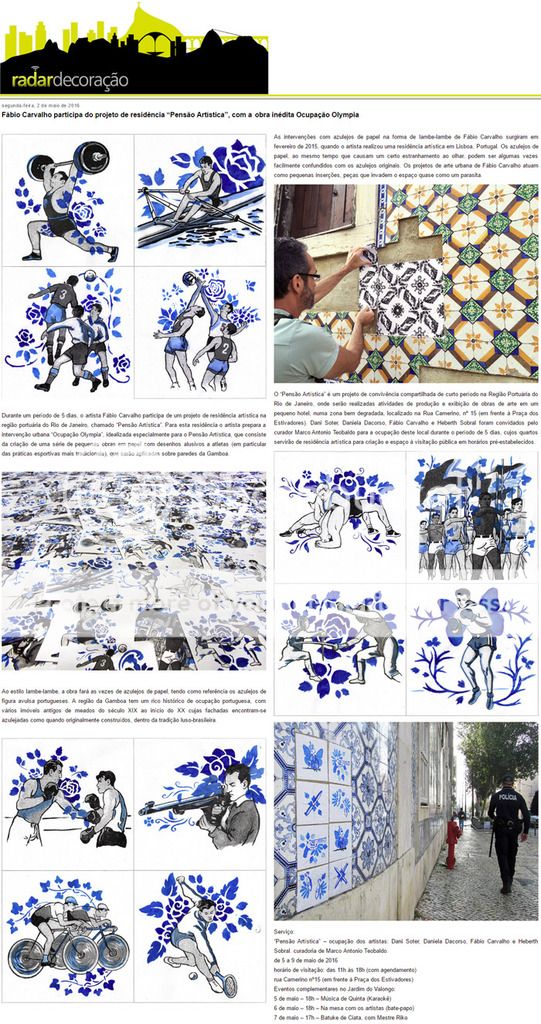 Entrevista para o programa "Jornal do Rio", do canal Band News, sobre o meu trabalho de intervenção urbana OCUPAÇÃO OLYMPIA, idealizada especialmente para o projeto Pensão Artística, que consistiu na criação de uma série de pequenas obras em papel, que remetem à azulejaria portuguesa, com desenhos de atletas, numa alusão direta à narrativa oficial de "legado dos jogos olímpicos" que é usada para justificar as transformações que a região passa há vários anos.